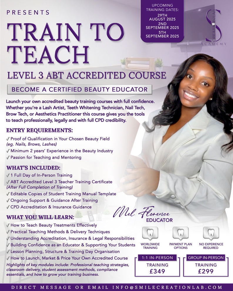 Train to teach other course will allow you to launch your own accredited beauty training courses with full confidence. Whether you’re a Lash Artist, Teeth Whitening Technician, Nail or Brow Tech, or Aesthetics Practitioner this course gives you the tools to teach professionally, legally and with full CPD credibility.